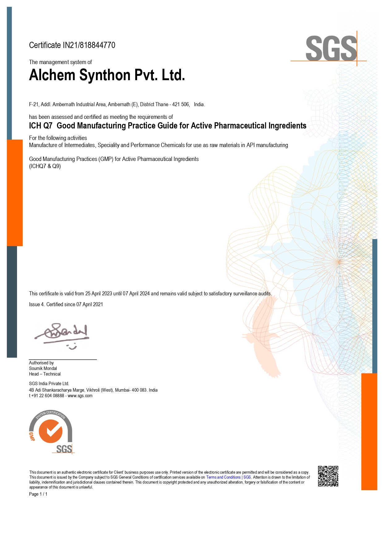 Alchem Synthon's core competence involves development and manufacturing of the Pharmaceutical Intermediates, Performance chemicals, Specialty Chemicals and Fine Chemicals through innovative approach. The products manufactured by ASPL are developed by its in-house Research and Development team. The Company strives to deliver its broad range of technology-based products to customers all over the globe. ASPL has a capable force of talented and dedicated team in various departments to achieve the set goals and fulfill customer requirements.